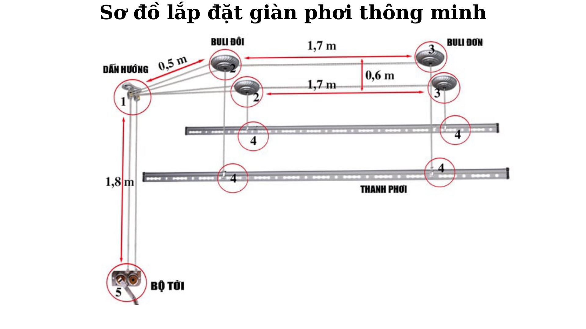 - Hệ thống ròng rọc: Gồm các puli chất lượng cao, đảm bảo quá trình nâng hạ thanh phơi diễn ra mượt mà, không gây tiếng ồn.